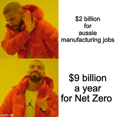 They are happy for the government to burn money at the altar of Net Zero, but make no mistake, they will be protesting in the streets if a single cent goes to working class Aussie jobs.